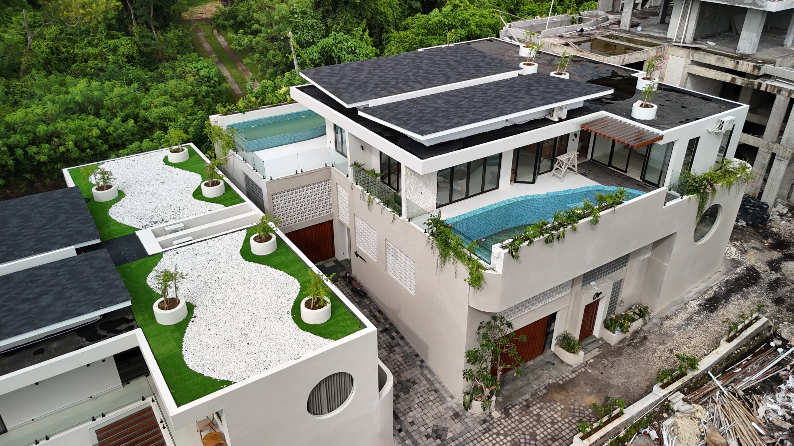 The upper floor houses two bedrooms. The master bedroom includes a private luxury jacuzzi, while the second bedroom features a generous bathtub and a lounge corner framed by open sky.